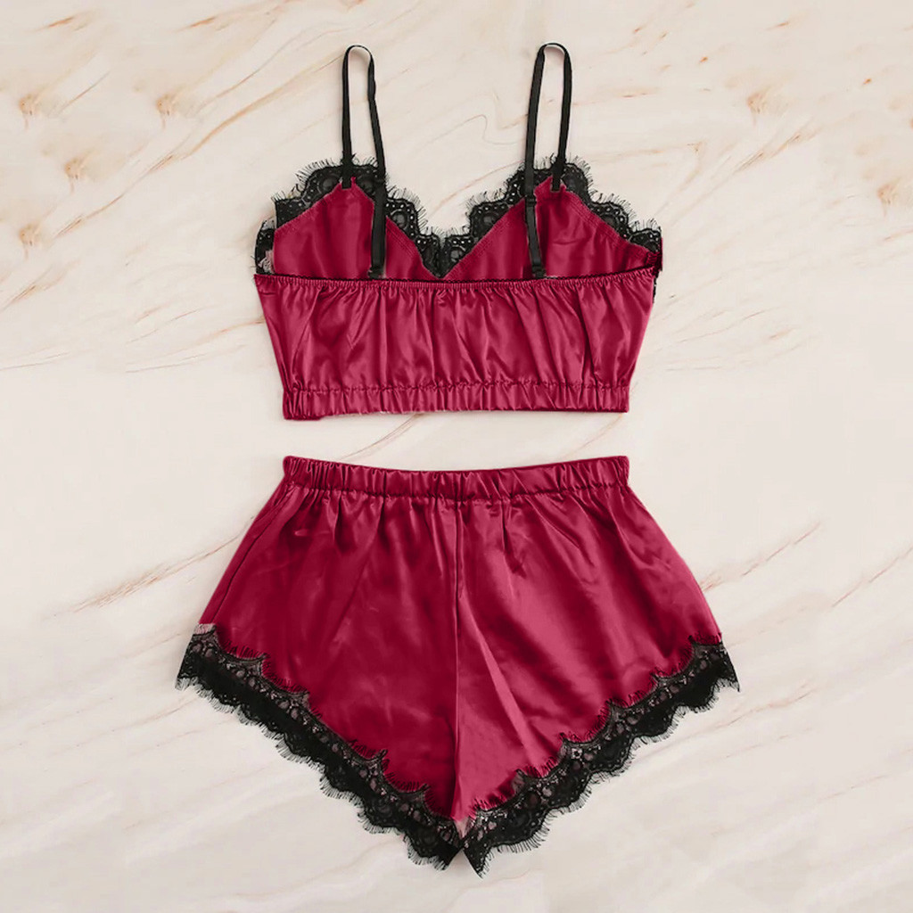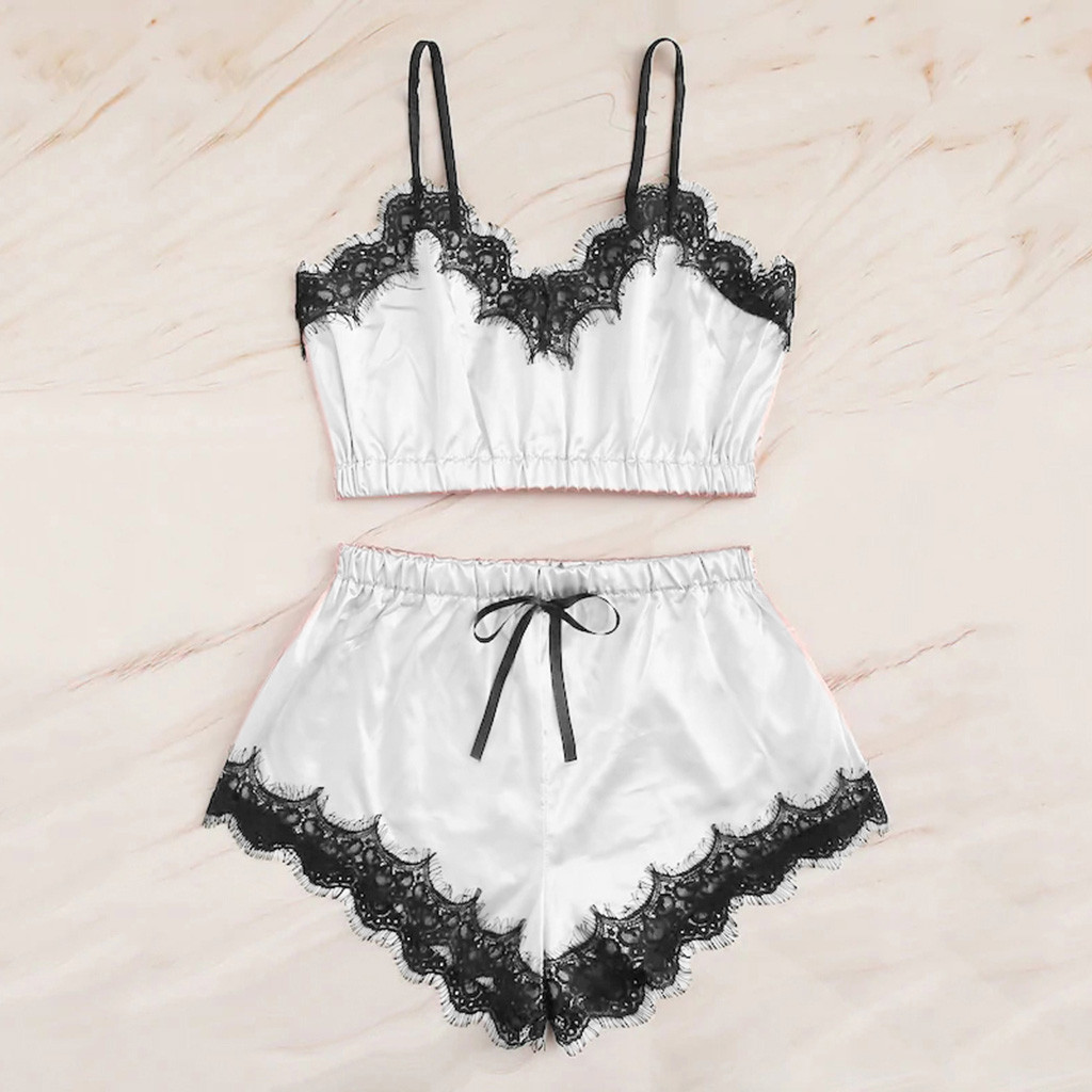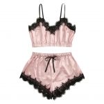 Women Sleepwear Sleeveless Strap Nightwear Lace Trim Satin Cami Top Pajama Sets