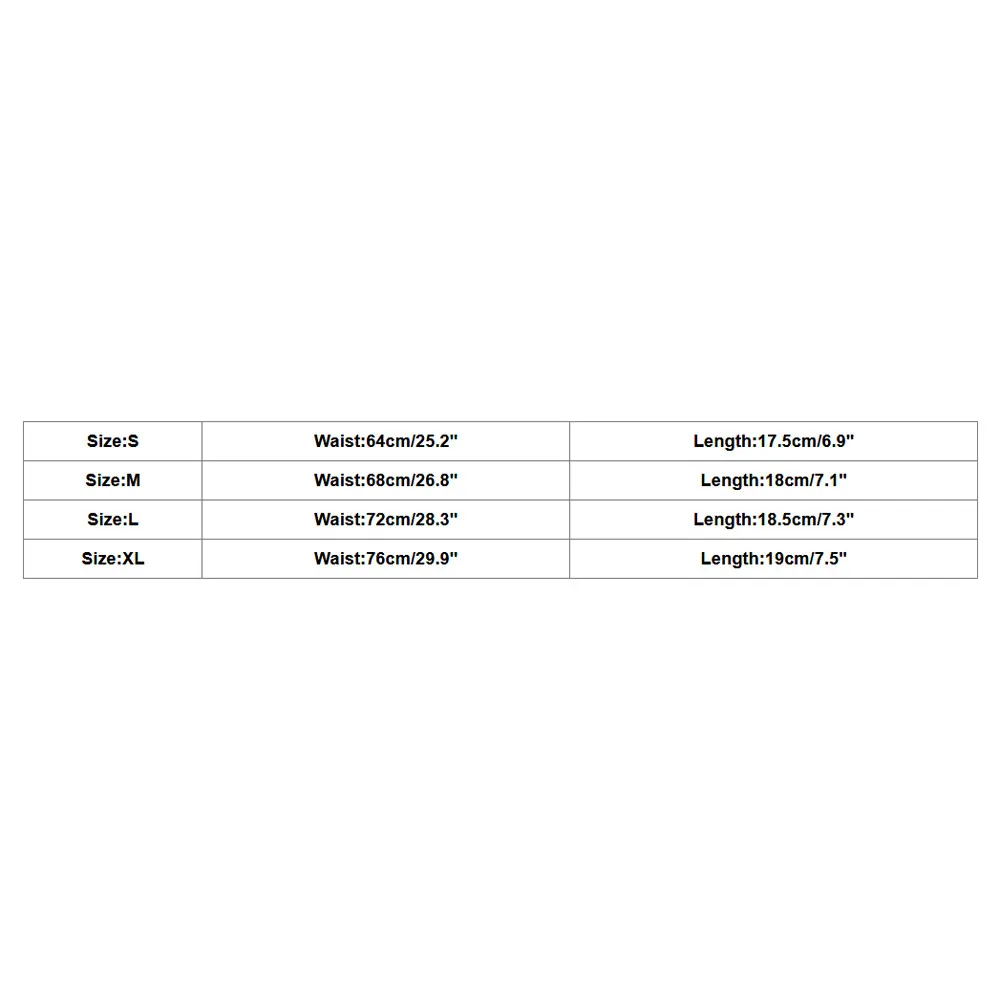 Size Waist Length S 64cm/25.2″ 17.5cm/6.9″ M 68cm/26.8″ 18cm/7.1″ L 72cm/28.3″ 18.5cm/7.3″ XL 76cm/29.9″ 19cm/7.5″