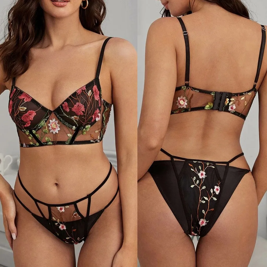 2PC New Women Embroider Bra +Thong Lingerie Set Underwear G-String Lace