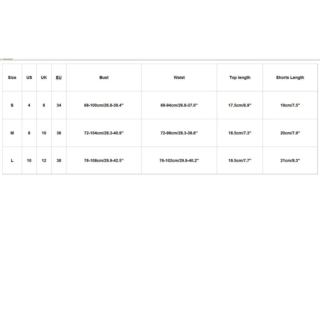 | Size | US | UK | EU | Bust | Waist | Top length | Shorts Length |