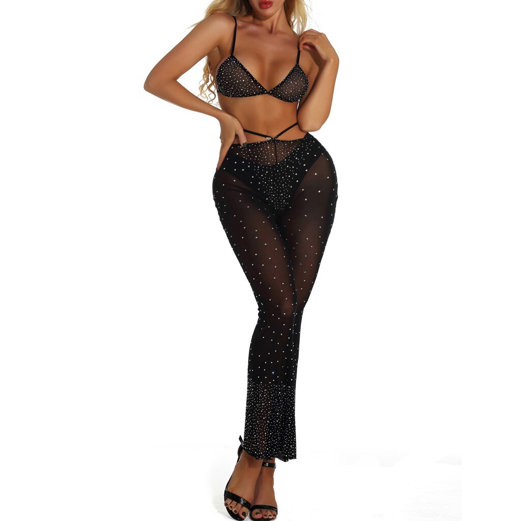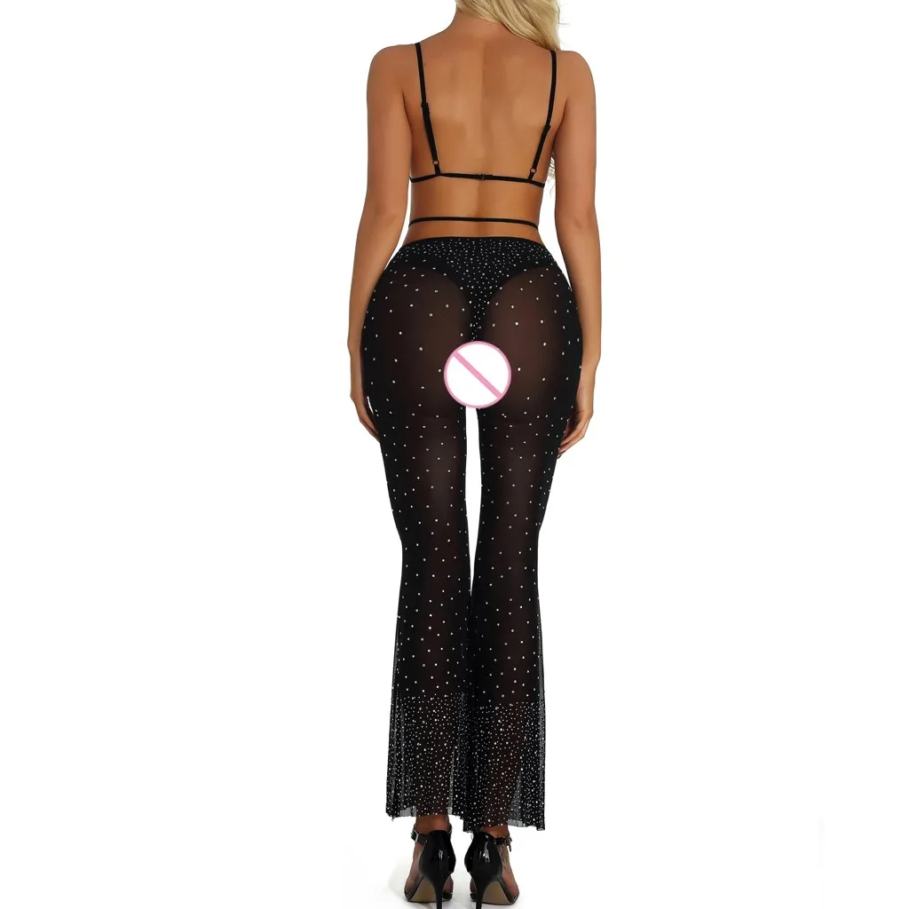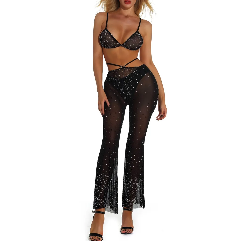 New Sexy Mesh Lace  Perspective Rhinestone Bra Hot Drill Trousers Underwear