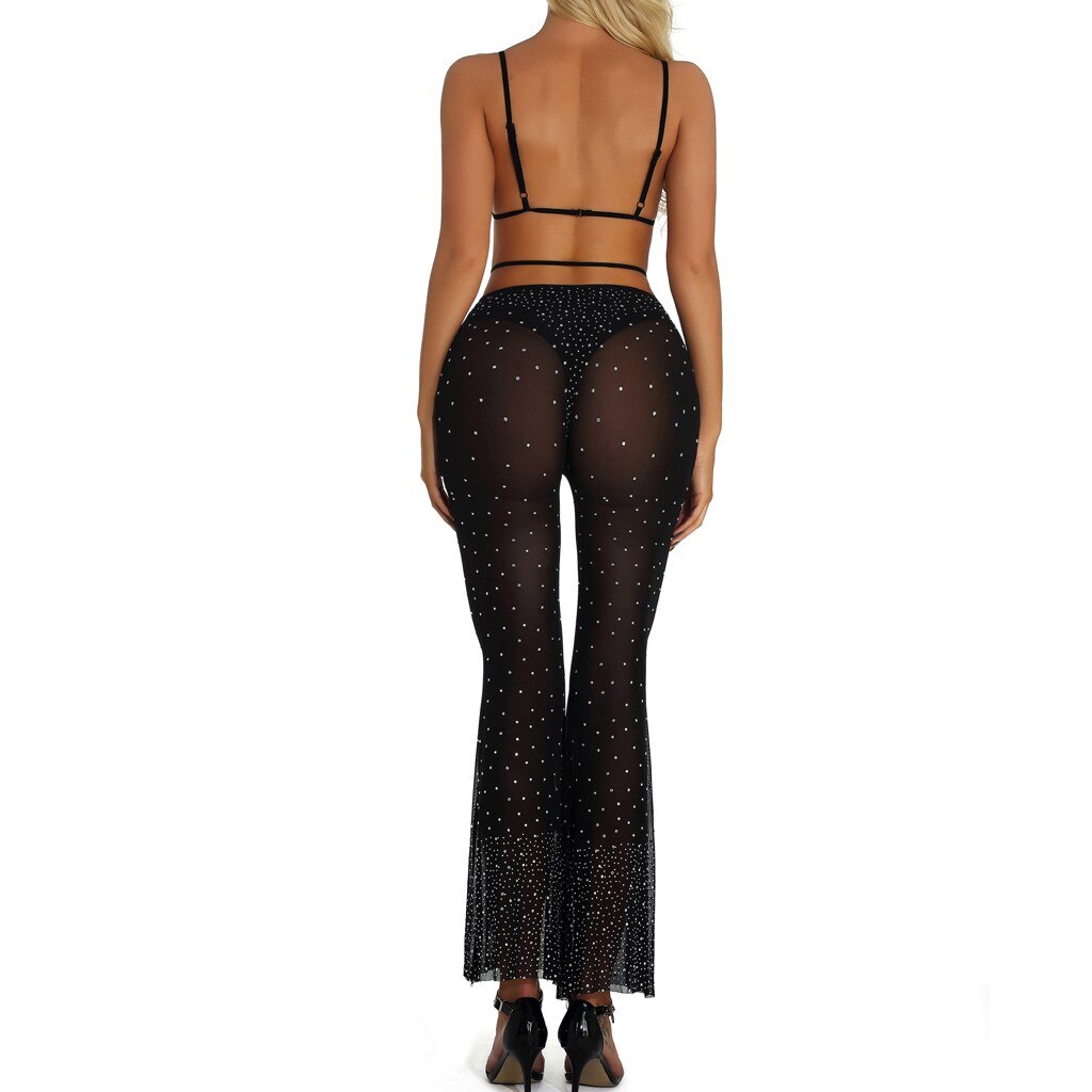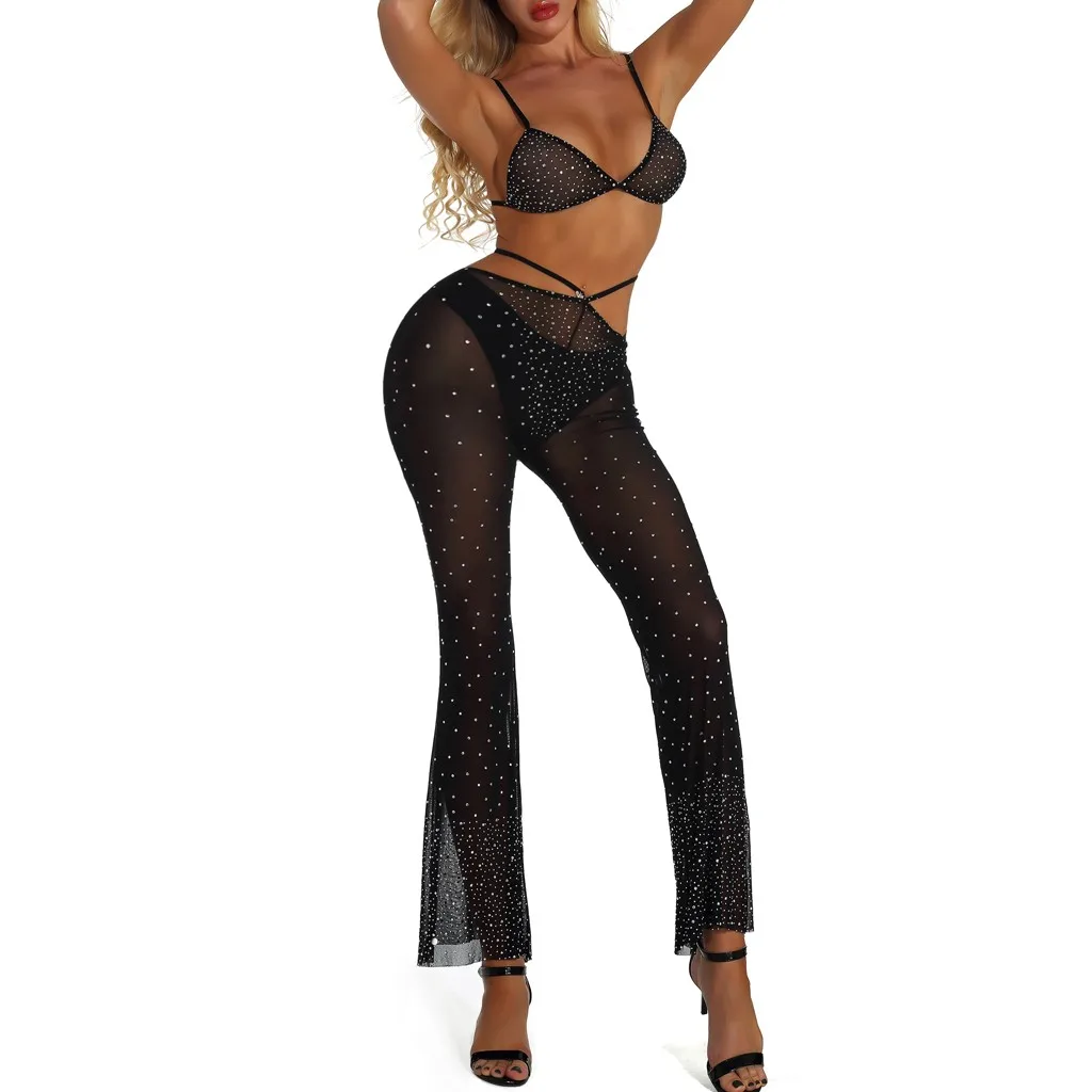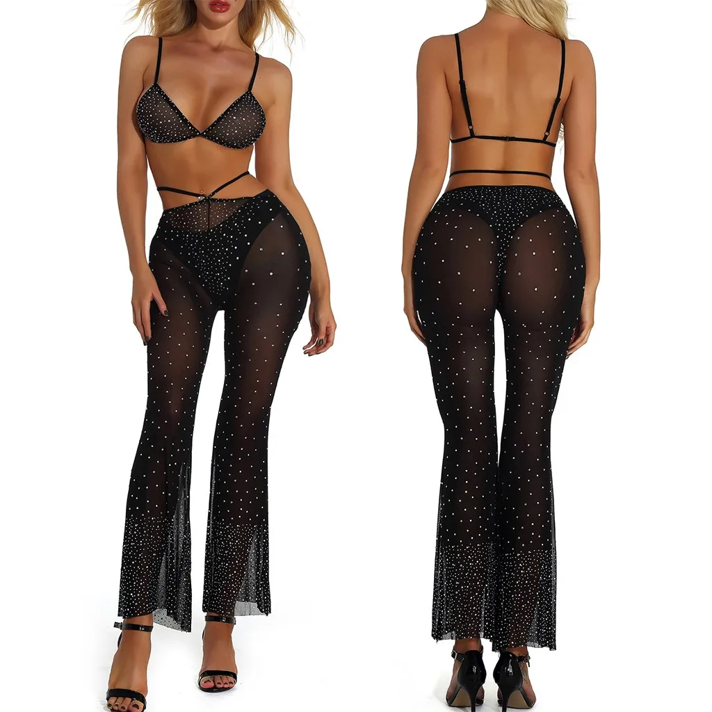 New Sexy Mesh Lace  Perspective Rhinestone Bra Hot Drill Trousers Underwear