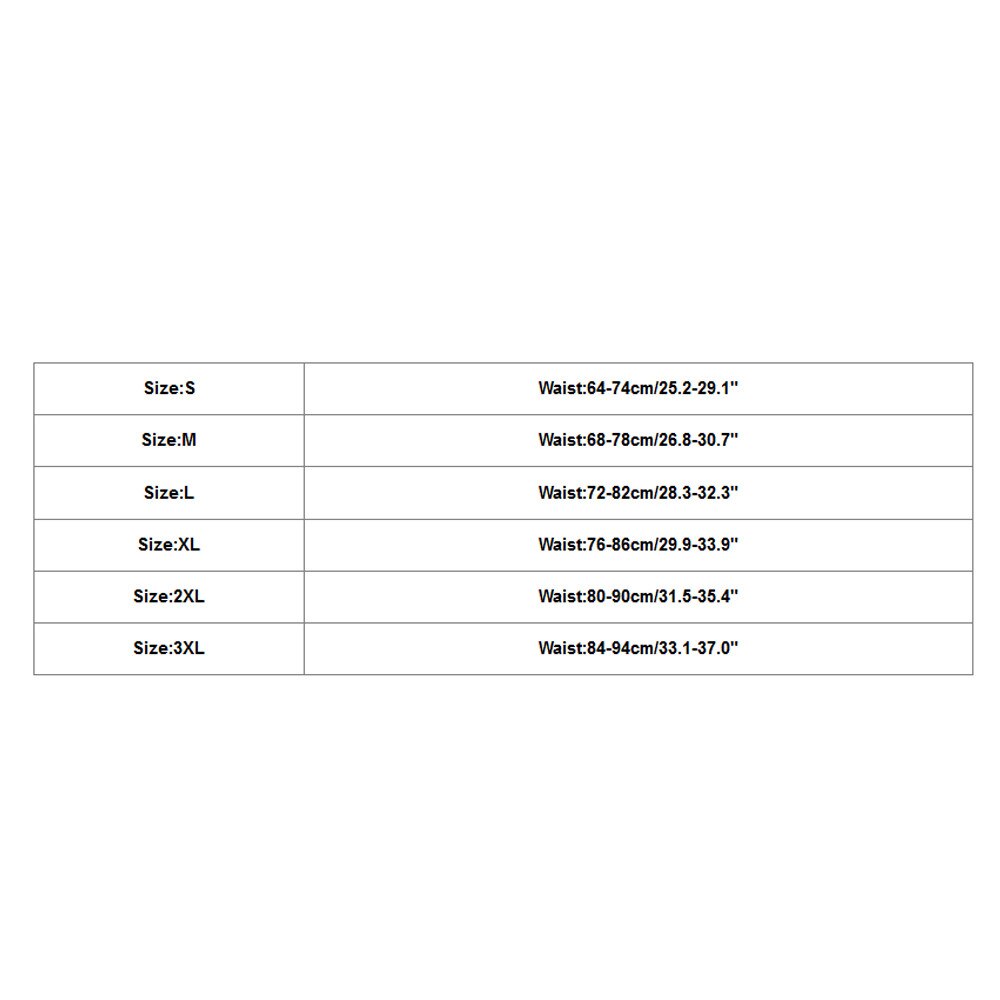 Size Waist S 64-74cm/25.2-29.1″ M 68-78cm/26.8-30.7″ L 72-82cm/28.3-32.3″ XL 76-86cm/29.9-33.9″ 2XL 80-90cm/31.5-35.4″ 3XL 84-94cm/33.1-37.0″