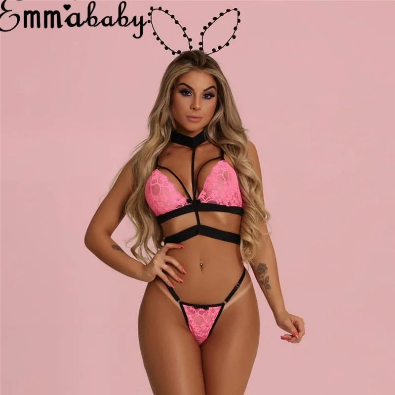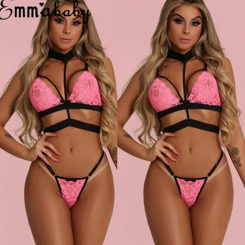 Porno Sexy Lingerie Women Lace Bralette Bra Set Pink Nightwear