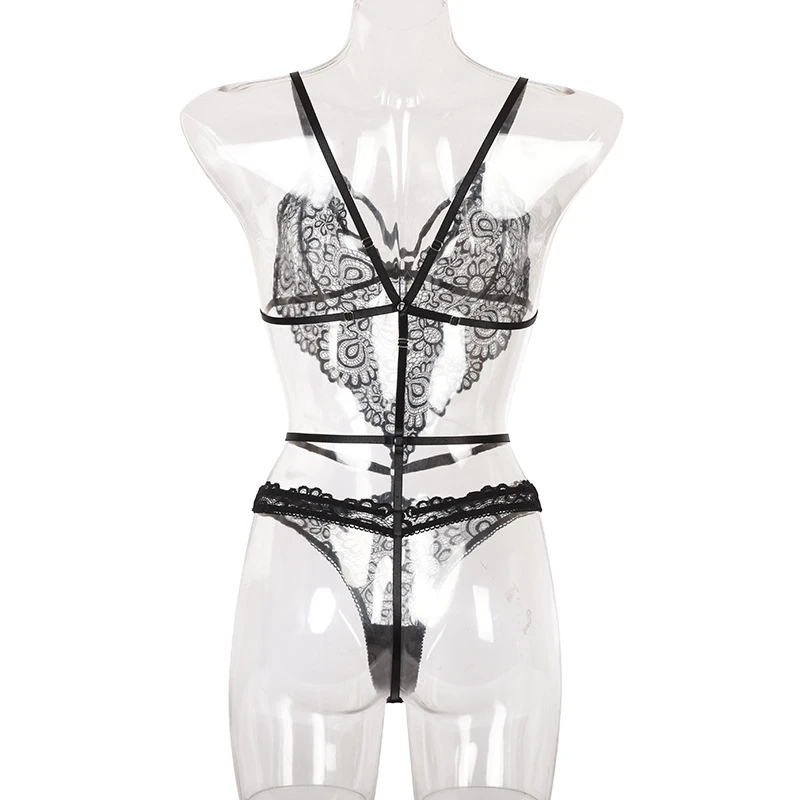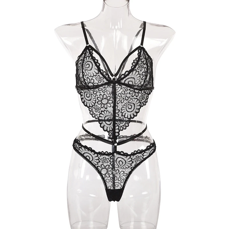 Women Lingerie Set Sexy Lace Print Hollow Out Bra Panty One-piece Suit