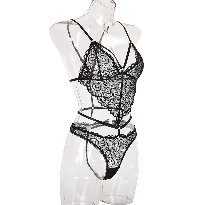 Porno Women Sexy Lace Lingerie Set Flower Printed Hollow