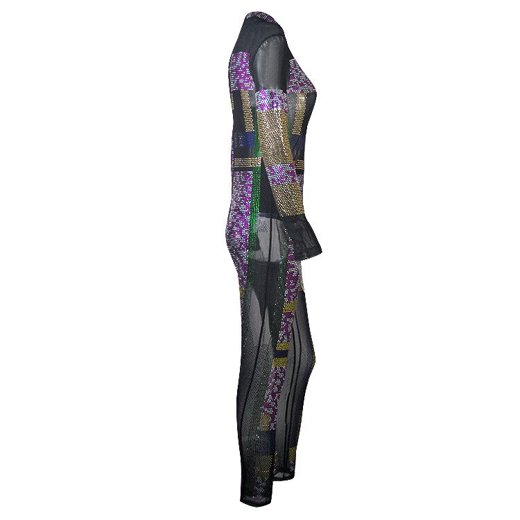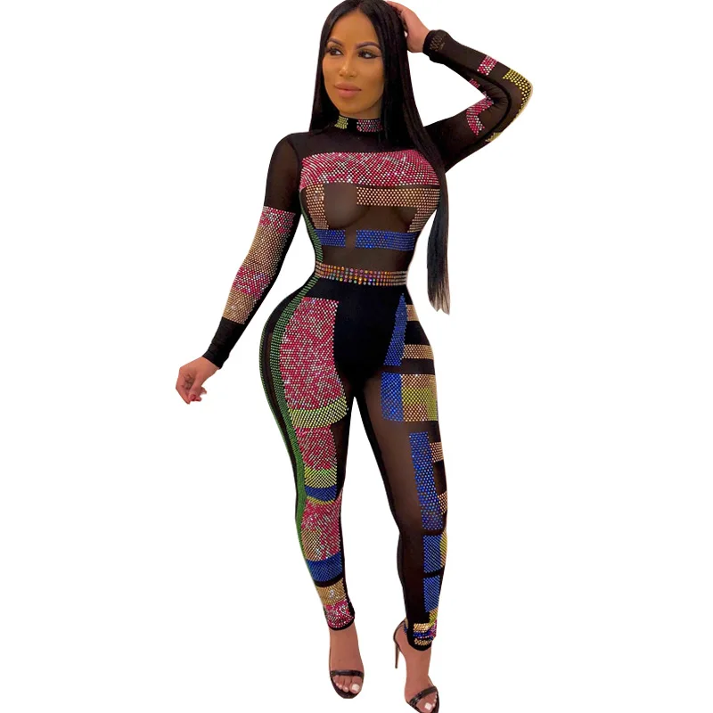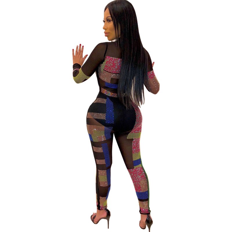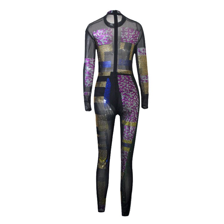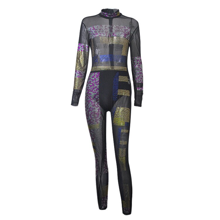 Sexy Diamonds Sheer Mesh Bodysuit Women Long Sleeve O Neck