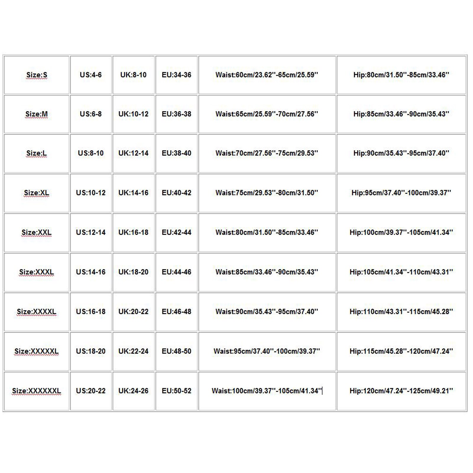 XXXXXXL 20-22 24-26 50-52 100cm/39.37”-105cm/41.34” 120cm/47.24”-125cm/49.21”