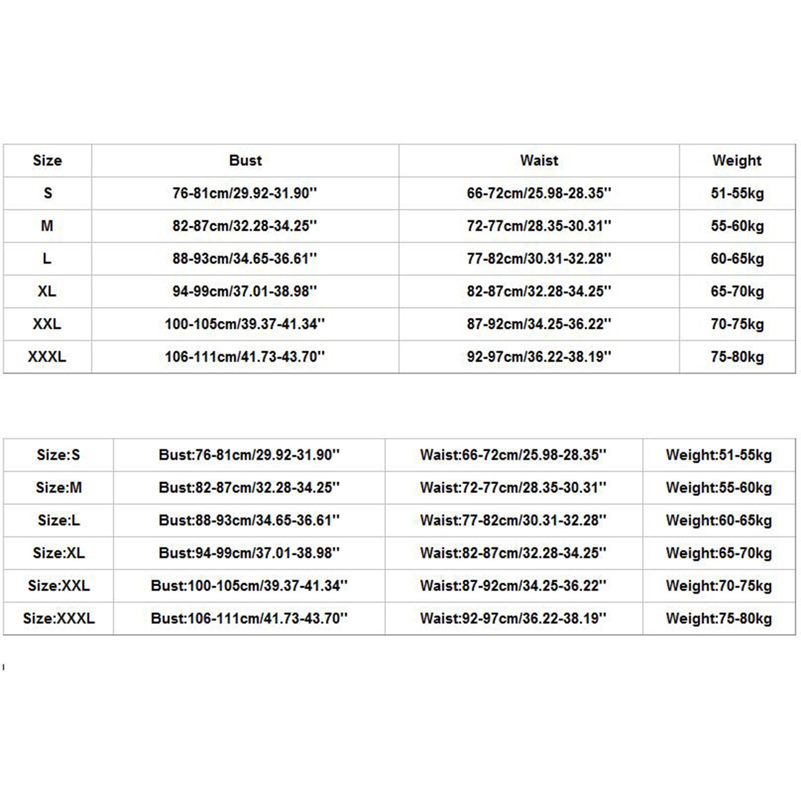 | Size | Bust | Waist | Weight |