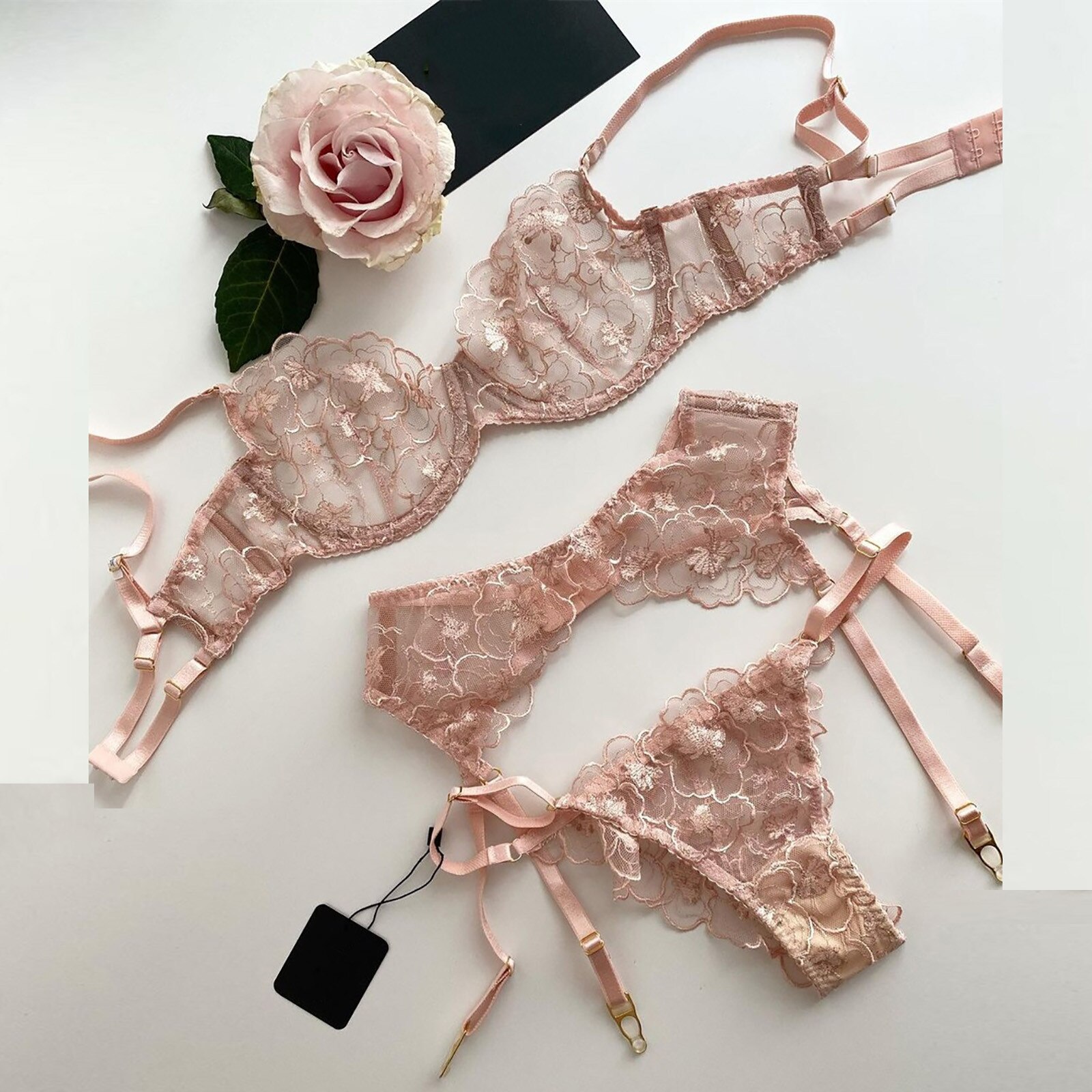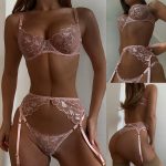 Women Exquisite Mesh Lingerie Bra+Garter+Briefs Set Babydoll Cut-Out Sleepwear
