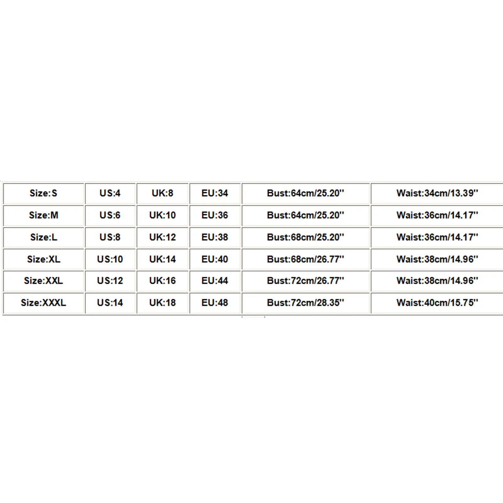 | Size | US | UK | EU | Bust | Waist |