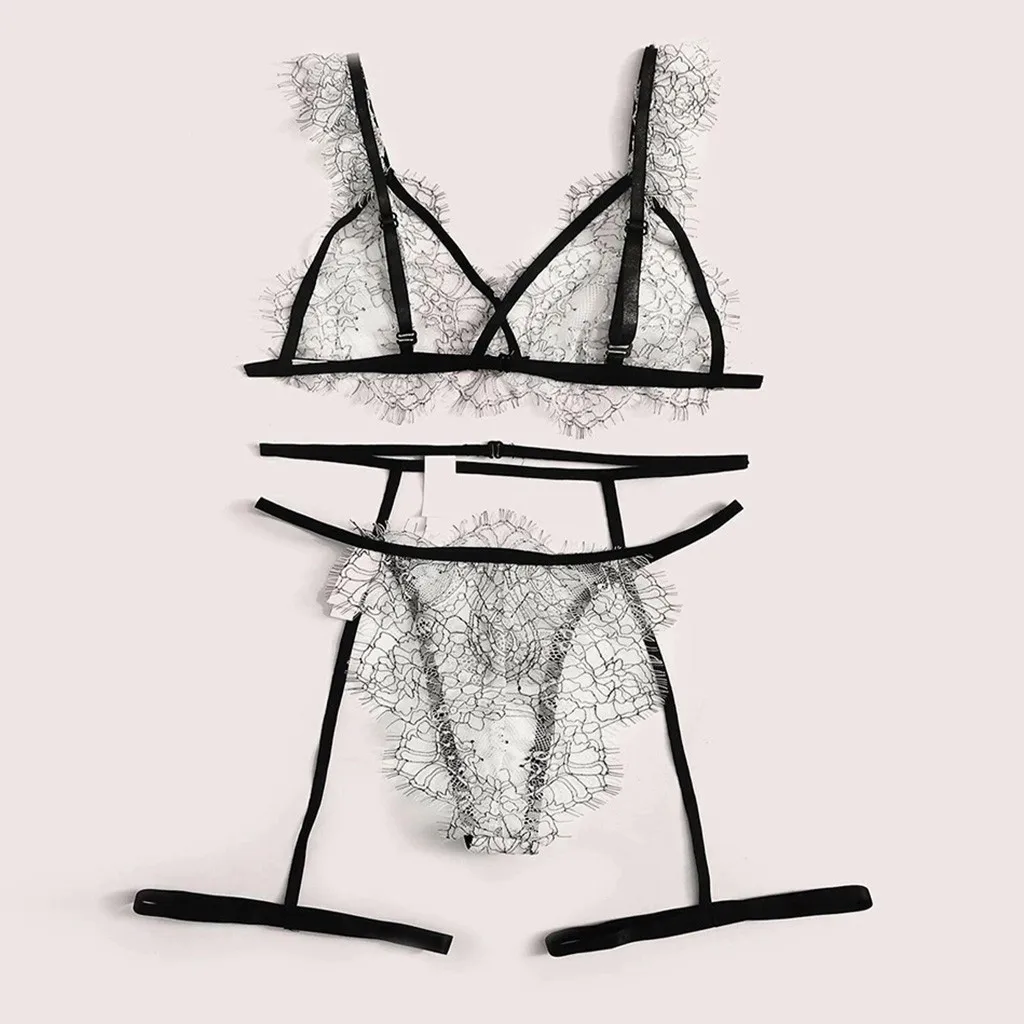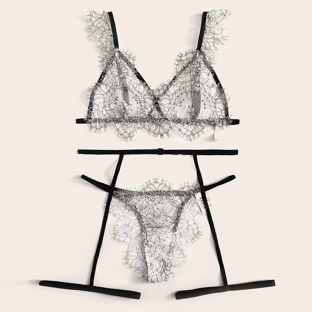 3PC Women Cute Sexy Eyelash Floral Lace Garter Pajamas Lingerie  G-String Set